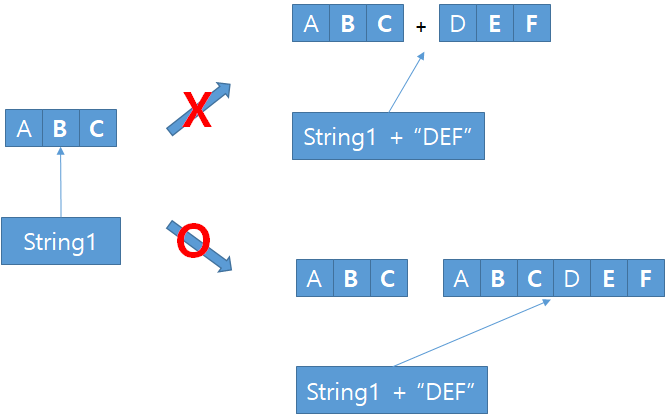 위의 그림에서 볼수있는 것처럼 String ABC를 ABCDEF로 바꾸고싶다고 한다면, 기존 ABC에 DEF를 붙이는게 아니라 그냥 새로운 ABCDEF를 메모리에 활동한다. 그렇게 되면 기존의 ABC는 메모리 일부를 차지하며 그대로 남아있게 되는것이다.