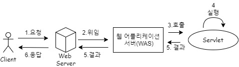 1)클라이언트가 서버에 요청을 하면 2)웹서버가 WAS에 위임하고 3)WAS가 서블릿을 실행하여 결과를 클라이언트에게 다시 보내준다.