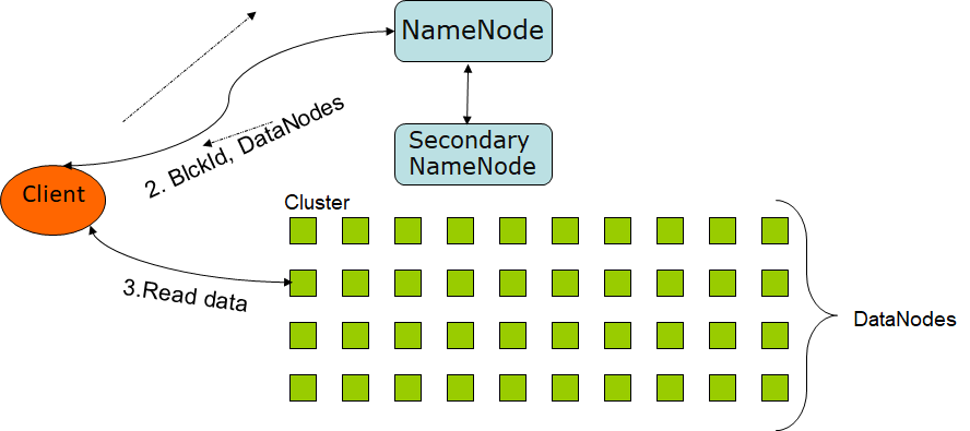 NameNode에는 분산시스템의 모든 MetaData를 관리한다. Secondary NameNode는 Fault tolereance 및 일시적 backup을 담당, 마지막 DataNode는 블록단위의 데이터를 저장, 관리하는 서버로 클라이언트 입출력요청을 관리한다.