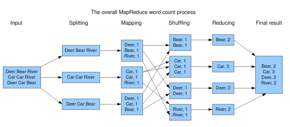 HDFS를 통해 분산된 데이터를 맵핑하고 축소(reducing)하는 방법이라고 이해하면 되겠다. 위의 그림을 통해 보면 Mapping -> Shuffling -> Reducing과정을 볼 수 있다.